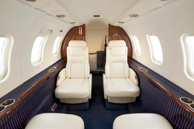 This aircraft is an executive 8 passenger double club. The headliner and upper sidewalls are pearl in color with modified drink rails. Passengers can enjoy the comfort of light pearl leather covered seats with lower side walls that are covered in a navy blue pinstripe fabric. The carpet is custom dark navy blue carpet and includes a navy blue aisle runner. A right hand galley refreshment center in the forward cabin features a solid countertop and hot and cold beverage service. The cabinets are finished in high gloss Sapele wood veneer with satin nickel fixtures throughout the cabin. This aircraft features an aft belted lavatory. Fireblocked.