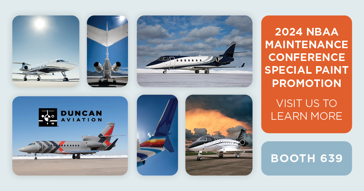 LINCOLN, NEB. — Duncan Aviation is excited to offer a special 2024 NBAA Maintenance Conference Paint Promotion for a complete exterior strip and repaint for owners and operators of large cabin aircraft. Act now to take advantage of the 10% incentive off the base price for select paint slots at the company’s full-service facility in Provo, Utah, with an input date between May 15th and July 31st of this year. Take advantage of the downtime and get an additional 5% off any interior refurbishment work added to the scheduled paint workscope, pending availability.