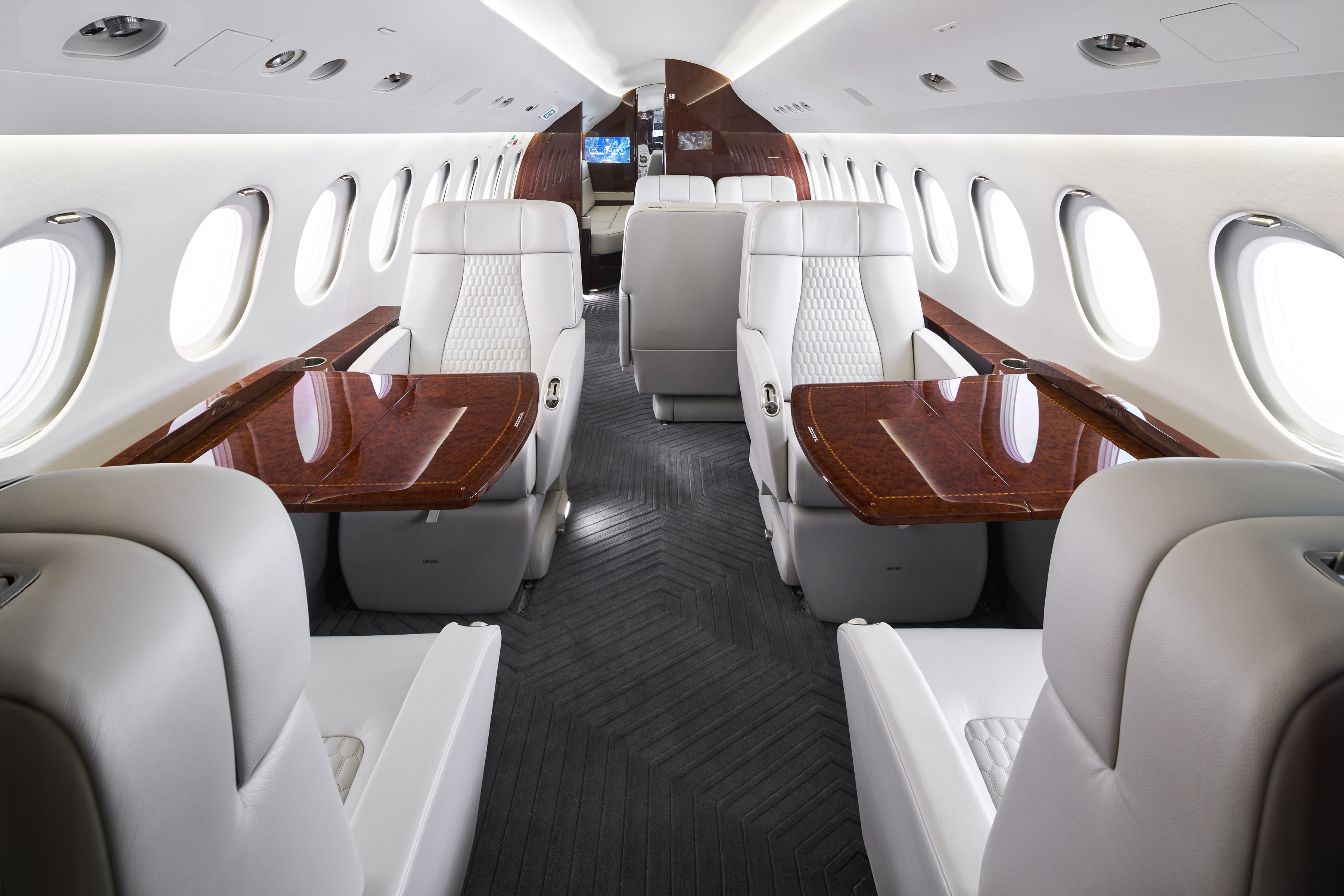 The interior of this Falcon 900EX is distinguished by its thoughtful approach to design continuity. Rather than replacing the original red-toned veneer, Duncan Aviation’s team embraced it—selecting complementary materials and a refined color palette to modernize the look without losing the aircraft’s character. The result is a cabin that feels both fresh and authentic.