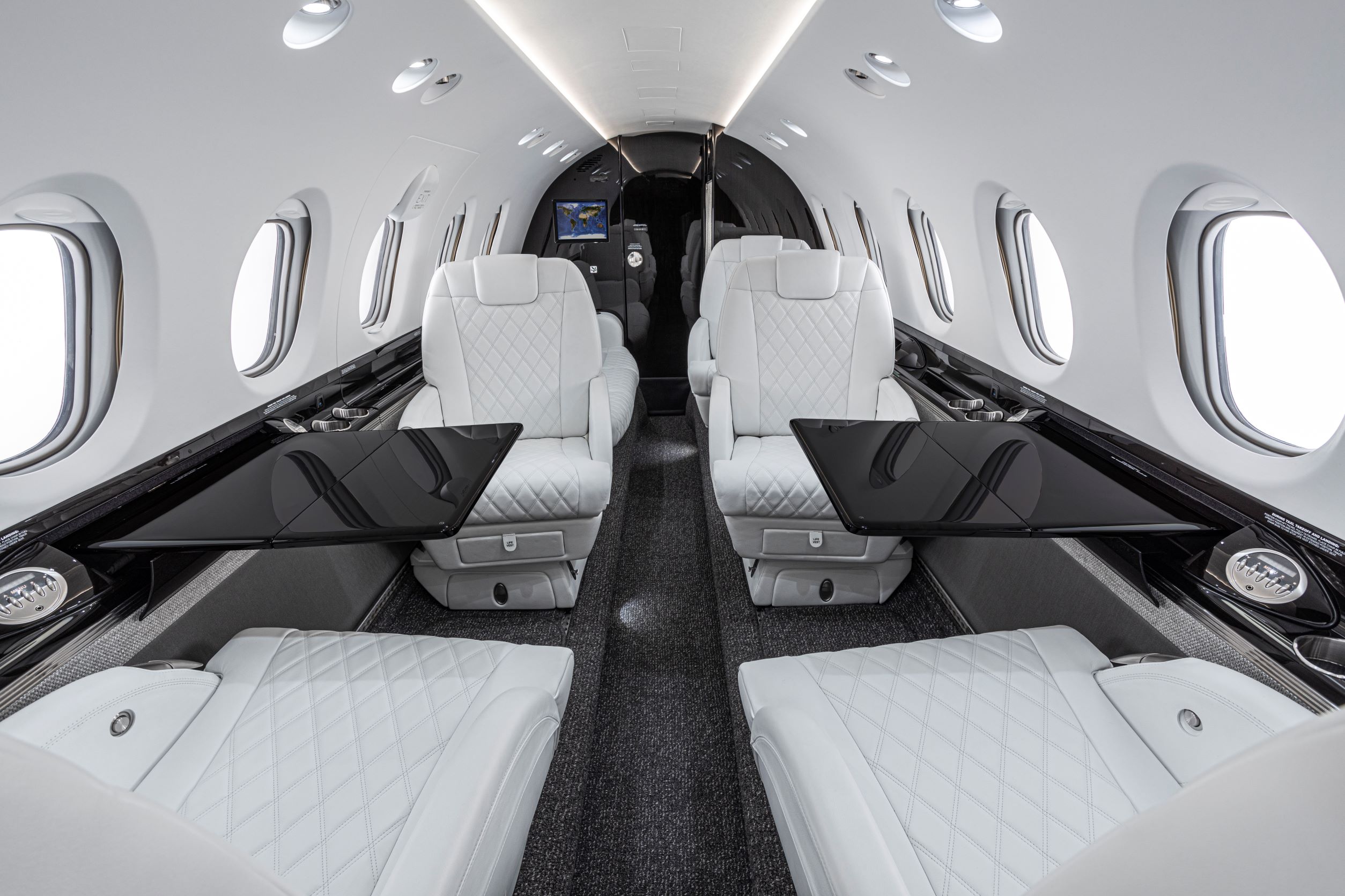 The owner wanted a clean, sleek, and modern interior, so Duncan Aviation Project Manager Carie Bruss, who was a Lead Designer at the time, gave the aircraft a “showroom” look by including white upholstery, dark woodwork paired with white-gold accents, and LED lighting.