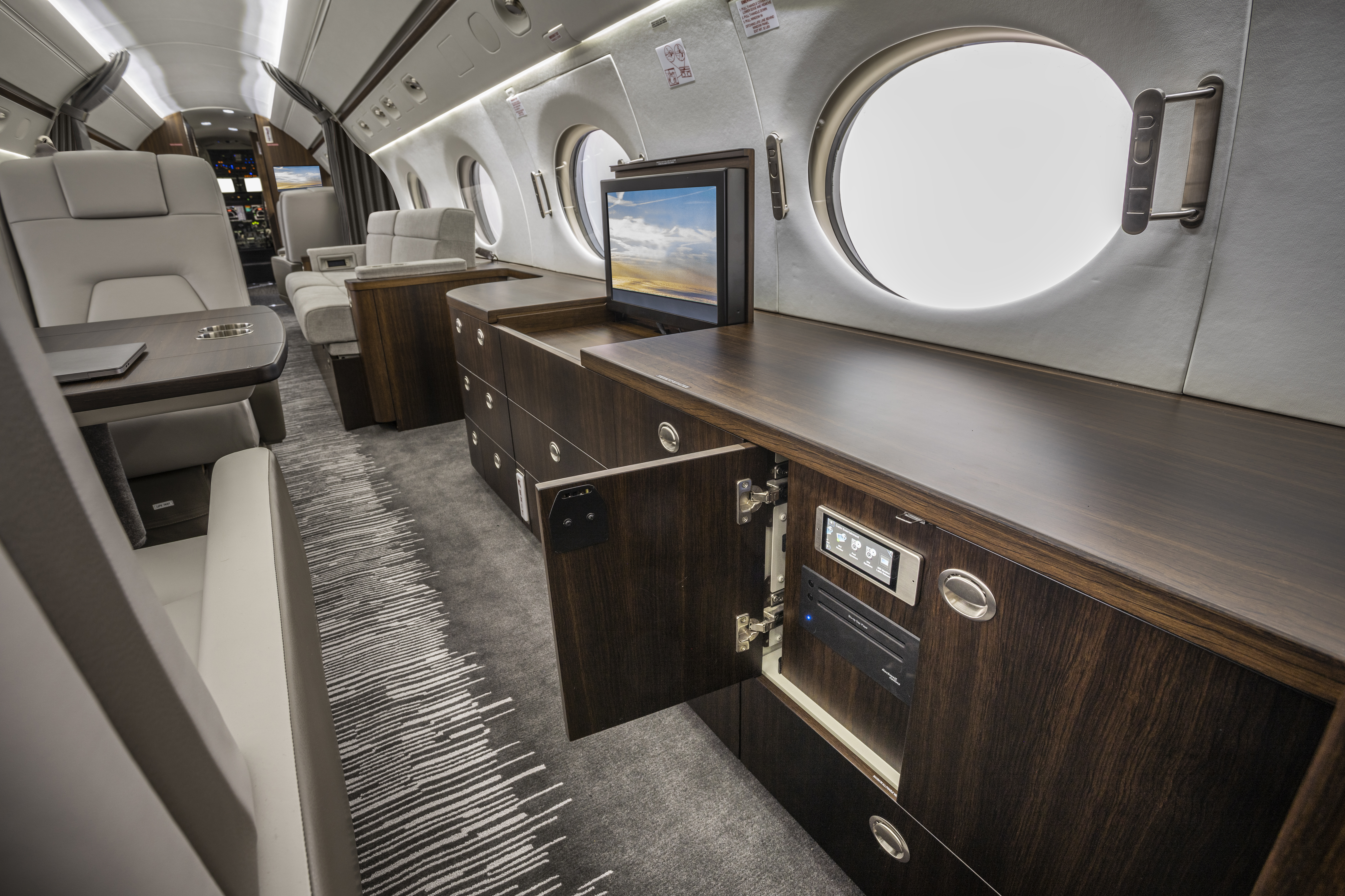 Because the owner’s family is frequently aboard the G550, the owner’s wife took an active role in the material choices and focused on the overall appearance of the interior, especially the veneer.