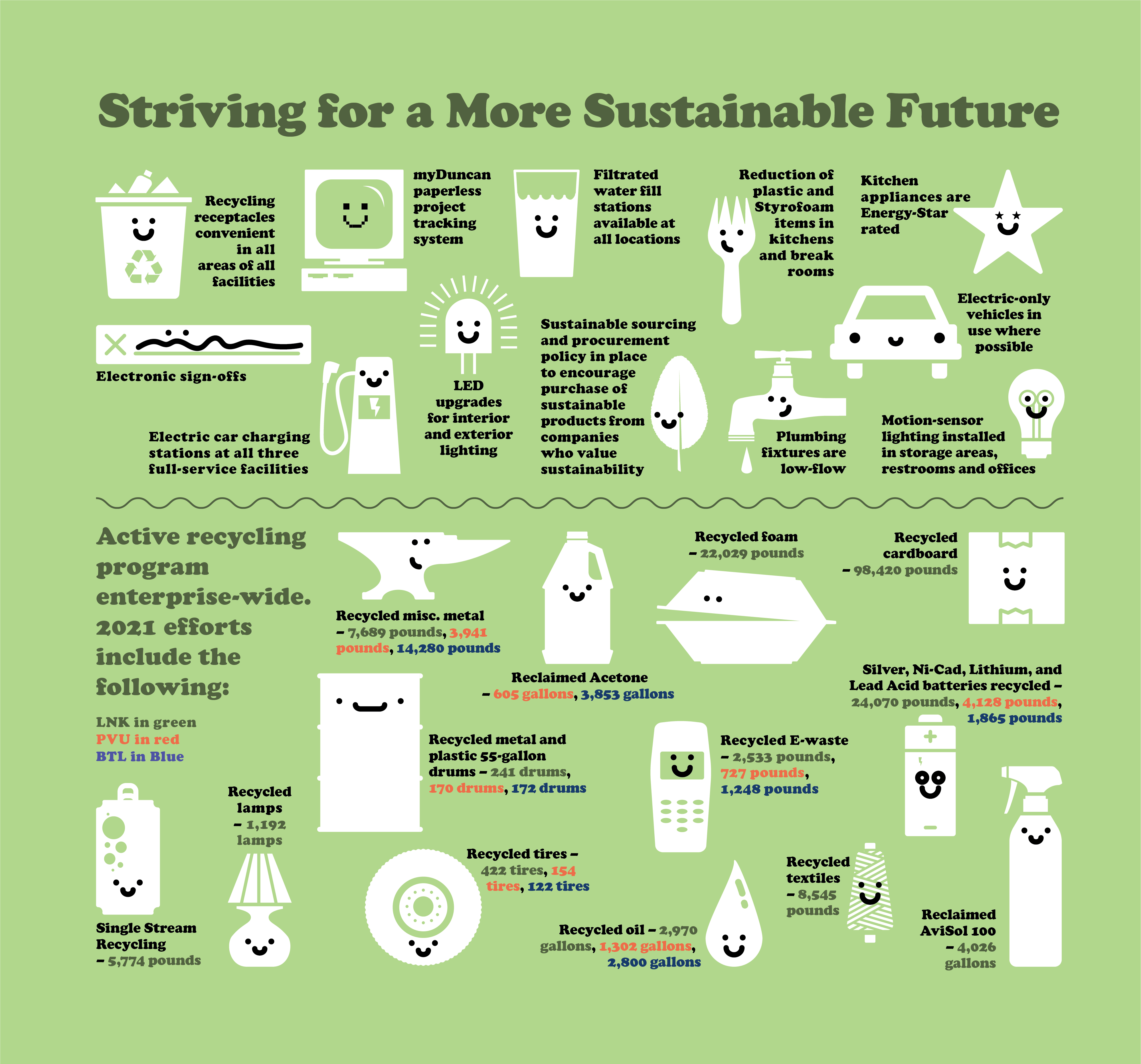 “We noticed a big improvement years ago when we gave team members who are passionate about green initiatives the latitude to develop and implement ideas through a committee initially called the Green Team,” says Kelly Becker, Environmental Supervisor for the Lincoln location. “We partnered with community volunteer organizations to organize various recycling and conservation educational efforts. Results included things like roadside cleanups, clothing and coat drives, and even a competition to see who could make award-winning items from recycled pallets or repurposed items. Robert Duncan himself is an electric car supporter, and he made sure we installed electric vehicle charging stations at all of our full-service facilities.”