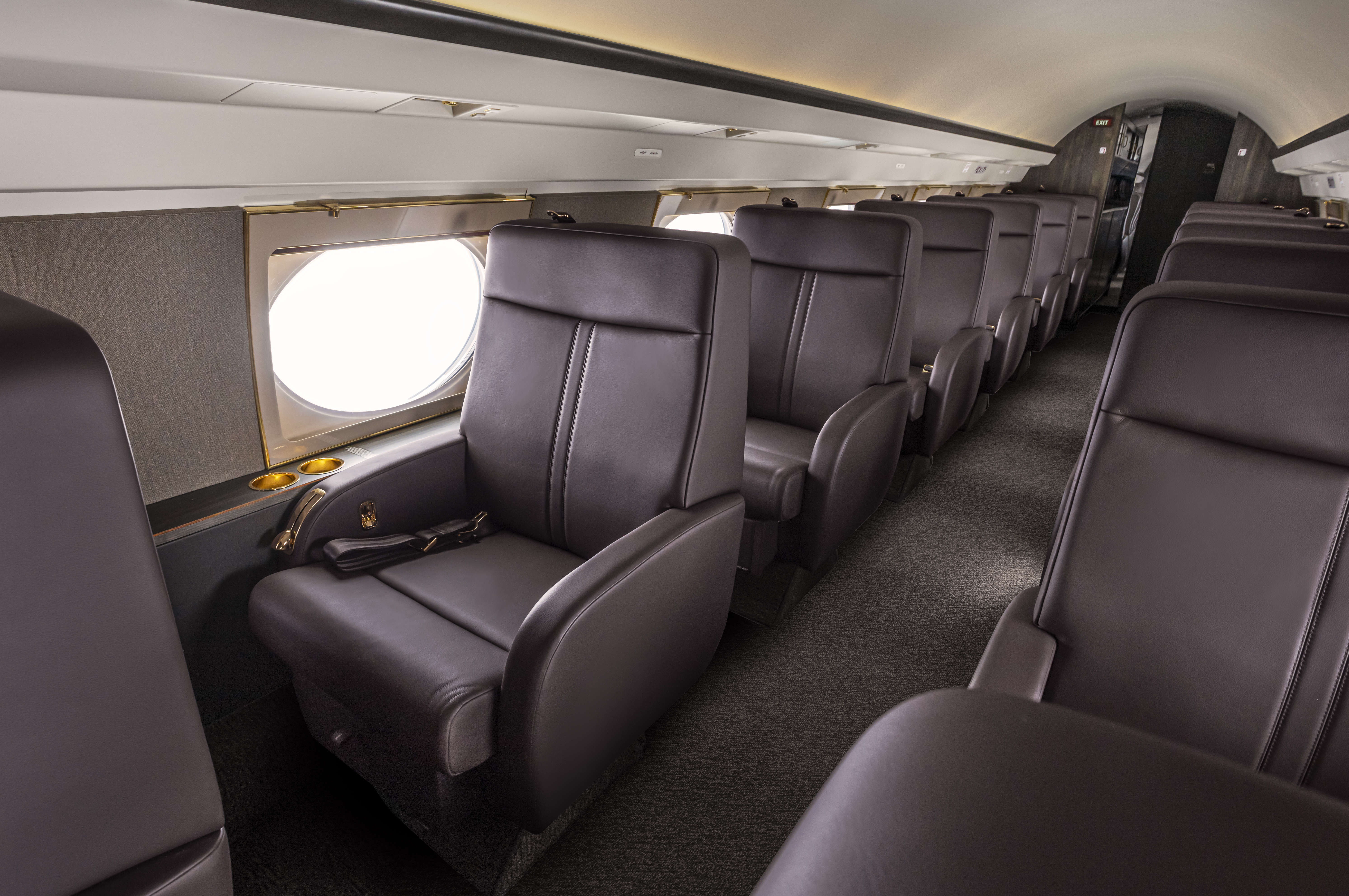 The Gulfstream GIV-SP delivered earlier this year with a completely refurbished and reconfigured interior featuring 14 individual club seats in walnut brown leather. The unique configuration has all of the seats facing straight ahead towards the cockpit, similar to typical airline seating. Many of the seats feature rotating bases, allowing them to pivot 180 degrees when needed, which gives the seats the flexibility to function more like seats do in a standard corporate configuration. In the end, countless hours of planning and execution all came together for a truly beautiful and versatile finished product and another satisfied customer.
