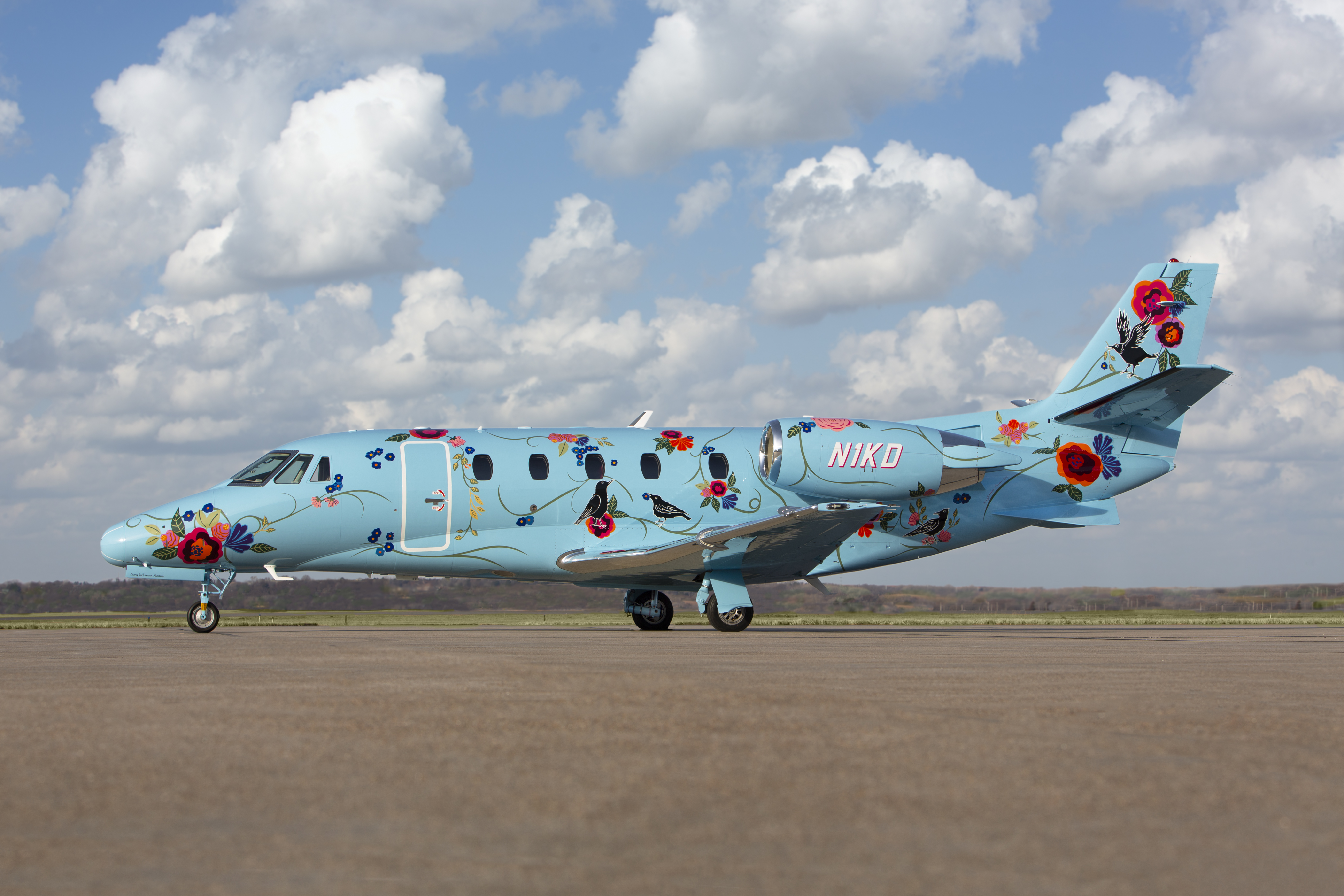 LINCOLN, NEB — Duncan Aviation recently held a private unveiling, called a vernissage in the fine art world, of the exterior and interior completion of one of its company aircraft. The commissioned design was created by renowned artist Nancy Friedemann Sánchez, a Colombian-American contemporary artist who has held exhibitions across the world and is based in Lincoln, Nebraska. Her design was requested by Duncan Aviation Chairman Emeritus J. Robert Duncan and his wife Karen and brought to life on a company-owned Citation 560XLS through the aircraft artisans of Duncan Aviation’s Lincoln-based full-service maintenance, repair and overhaul (MRO) facility.