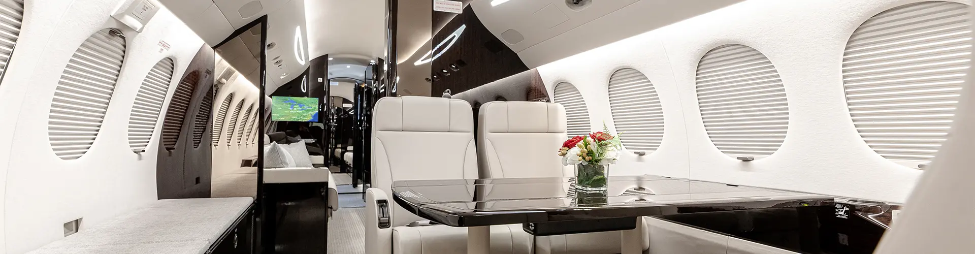 Beautifully refurbished interior of Falcon 7X showing cream leather chairs and dark wood table with cream and dark wood accents throughout