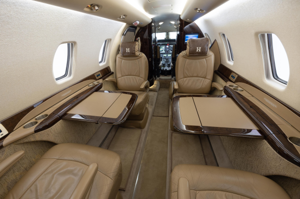 DESCRIPTION: Well-appointed interior in overall Beige Leather. Forward right side, side-facing seat, mid-cabin club configuration with an aft 3-place couch. Sheep Skin inserts on crew seats. Beige fabric window reveals and lower sidewalls. Soft beige cut pile carpet. Walnut Burl Cabinetry with Satin Veneer finish. Satin Almond Gold hardware. Dual Disc DVD player w/ remote. 10.4” LCD Video Monitor. Airshow 4000. RH Refreshment Center. Non-belted, externally serviceable toilet in lav with vanity cabinet and aft closet. 110-volt outlets throughout.