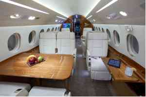 10 passenger configuration with double club, four place conference group and an aft club with an offset aisle lavatory door