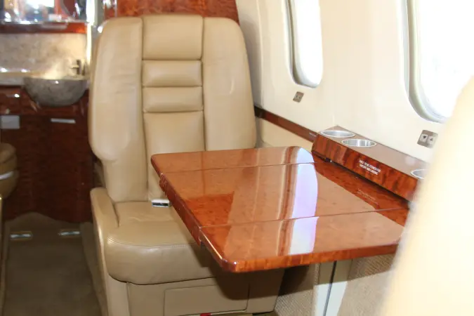 Executive/8 passenger configuration. Forward 3-place divan, forward-facing single seat, aft 4-place club completed in Aristo Aeronappa osprey leather. Headliner is Tapis almond ultraleather. Sidewalls are Pollack cross stitch fabric dado panels. Carpet is Light beige. Forward galley w/ice drawer & storage. Cabinetry/Wood complete with Carl Booth Acajou pommele veneer. Airshow 200, CD player, VHS player, forward-mounted slideout monitor, headphone jacks at each seat. MSA electric window shades, Corragio bella carmel curtains. Aft flushing lav. Fireblocked By Business Air Center on 10/2005.