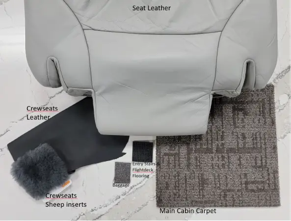 Partially refurbished interior: reconditioned dove grey leather seats, leather headliner, sidewalls, and lavatory seating. Cockpit crew seats recovered in Moore and Giles Apollo North Black leather with black sheepskin seat inserts. Cabin refinished with Redrock Atelier Supra RR-010 dark grey carpet. New black cockpit floor covering, new yoke boots, and baggage compartment recovered with dark grey Grosepointe with flip out vinyl baggage door cover. Duncan Aviation, June 2021.