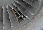 The damage to the TFE731 engine above was caused by a bird strike. Duncan Aviation's technicians found damage to the fan blades, nose cowl leading edge, fan stator, and compressor impeller... just to name a few. Depending on the strike, one bird can cause more than half-a-million dollars in damages.