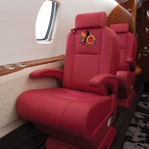 The interior of the aircraft was in decent condition, but with such a unique paint scheme, it needed to better complement the exterior. The Duncan Aviation team kept the veneer and cabinetry, but refurbished the headliner, the window panels, the lower sidewalls, the seats and the carpeting. The interior sports strawberry and cayenne colored leather and includes intricate embroidery, including a special raven in honor of Karen. The aircraft’s unique carpet design has a cut pile with an abstract dropdown well and a design that is reminiscent of animal hide.