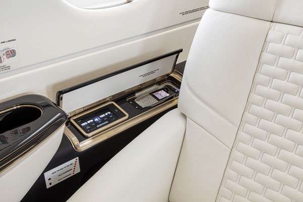 Why the sporty red paint? Back in 2019, Duncan Aviation painted the owner’s Phenom 100 Ferrari red to match his Ferrari collection. We recently gave his Legacy 500 a similar makeover, with an interior highlighted by a natural stone cambria flooring, quilted pattern on the seats and divan, and carbon fiber hydrodipped drink rails, tables, and accent pieces. It also received avionics upgrades consisting of a new monitor, touchscreen, HDMI ports, USB ports, Gogo AVANCE L5, and CMS.