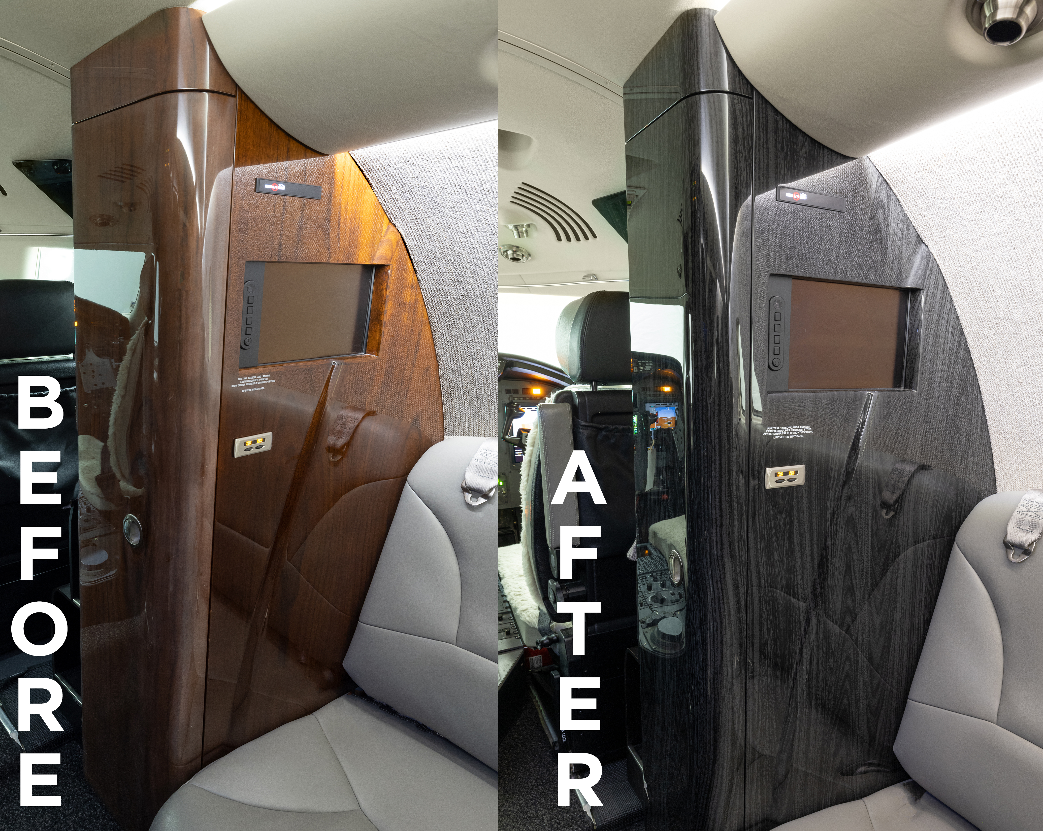 Nelson and his team hydrodipped the lavatory cabinet, vanity, aft dividers, pocket doors, drink rails, tables, left-hand forward galley, and right-hand forward entertainment cabinet with a design that was similar to a flat-cut walnut veneer with a grey background.